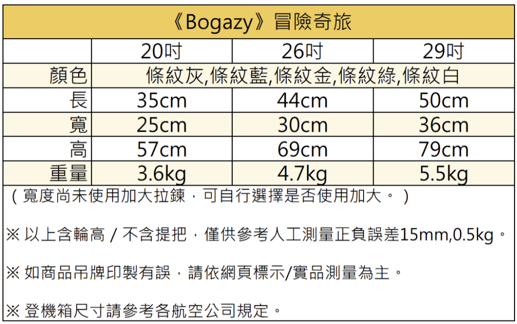20吋約 – 長35*寬25*高57 cm,約 3.6kg